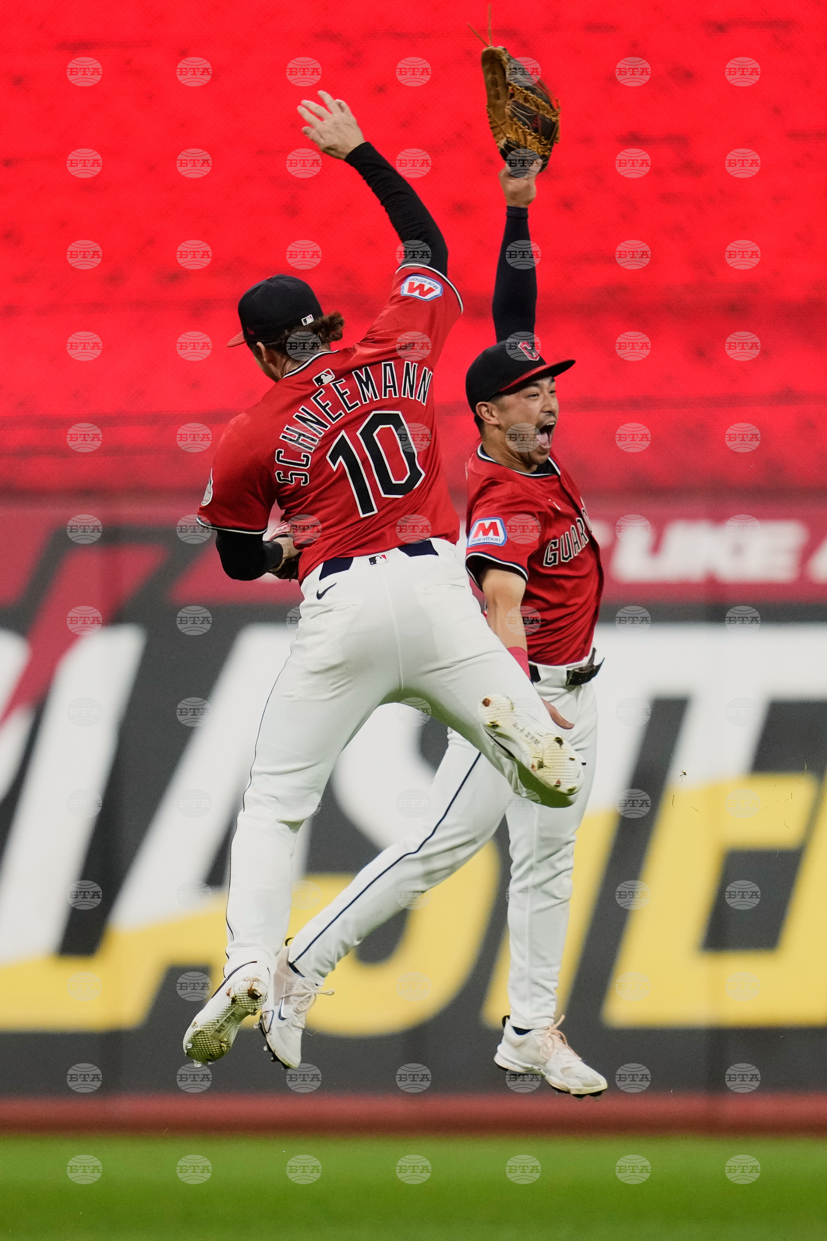 Cleveland Guardians left fielder Steven Kwan, right, and second baseman Daniel Schneemann, (10) celebrate after the Guardians defeated the Detroit Tigers in baseball game in Cleveland, Tuesday, Sept. 23, 2025. (AP Photo/Sue Ogrocki)