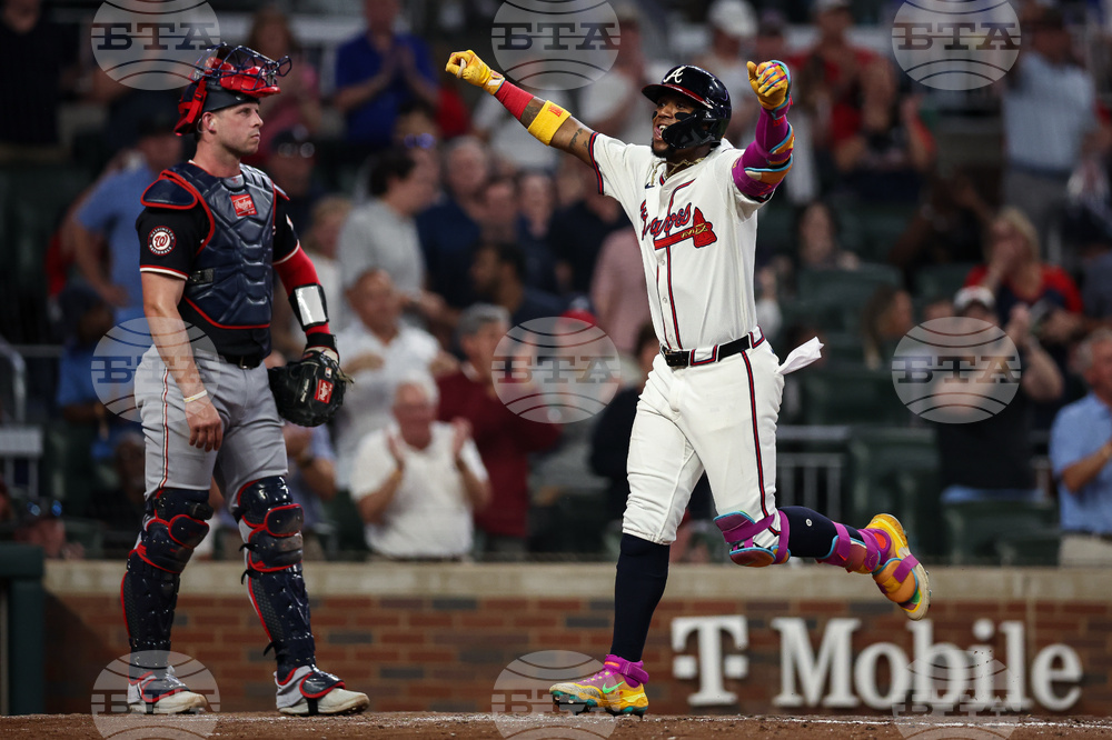 Atlanta Braves' Michael Harris II reacts after hitting a solo home run in the seventh inning of a baseball game against the Washington Nationals, Tuesday, Sept. 23, 2025, in Atlanta. (AP Photo/Colin Hubbard)