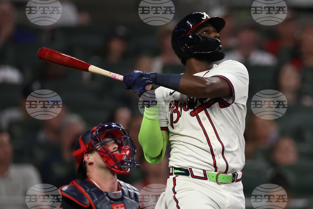 Atlanta Braves' Michael Harris II hits a solo home run in the seventh inning of a baseball game against the Washington Nationals, Tuesday, Sept. 23, 2025, in Atlanta. (AP Photo/Colin Hubbard)