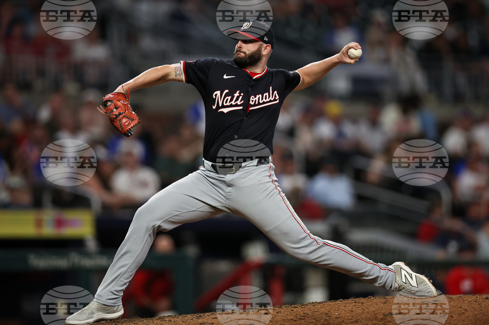 Washington Nationals pitcher Clayton Beeter delivers in the seventh inning of a baseball game against the Atlanta Braves, Wednesday, Sept. 24, 2025, in Atlanta. (AP Photo/Colin Hubbard)