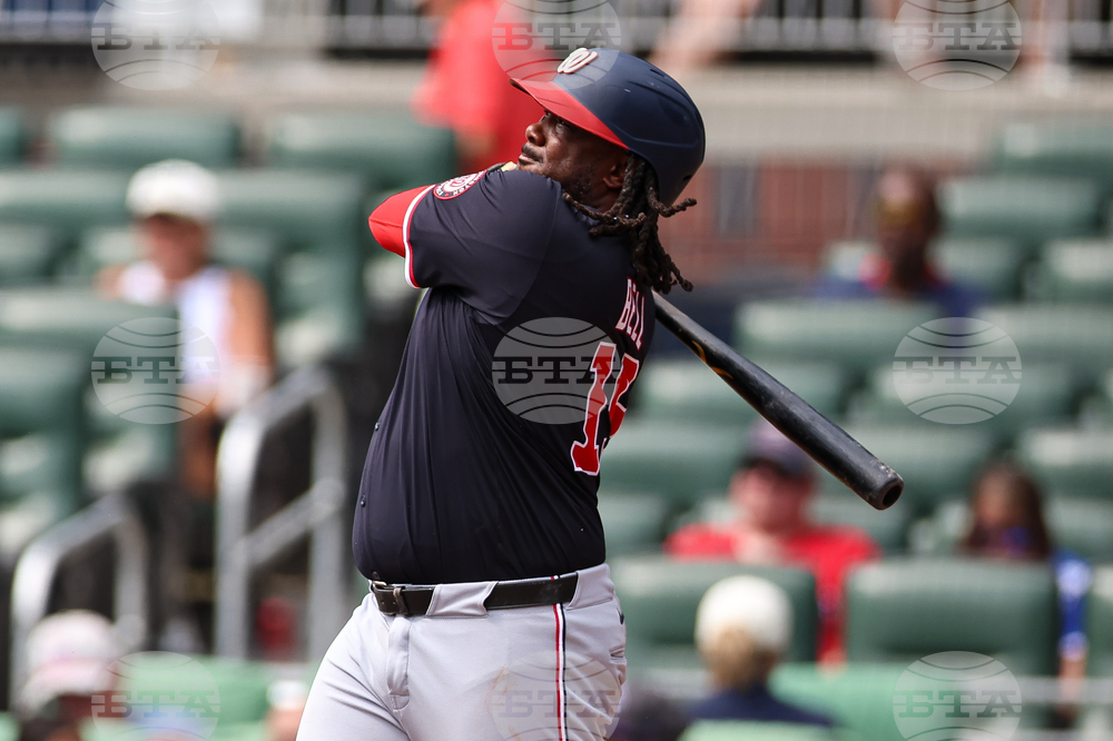 Washington Nationals' Josh Bell hits a solo home run in the fourth inning of a baseball game against the Atlanta Braves, Wednesday, Sept. 24, 2025, in Atlanta. (AP Photo/Colin Hubbard)