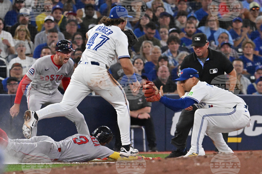 Boston Red Sox's Ceddanne Rafaela (3) is tagged out at third base by Toronto Blue Jays second baseman Andres Gimenez, right, after being caught in a rundown in the sixth inning of a baseball game in Toronto on Tuesday, Sept. 23, 2025. (Jon Blacker/The Canadian Press via AP)