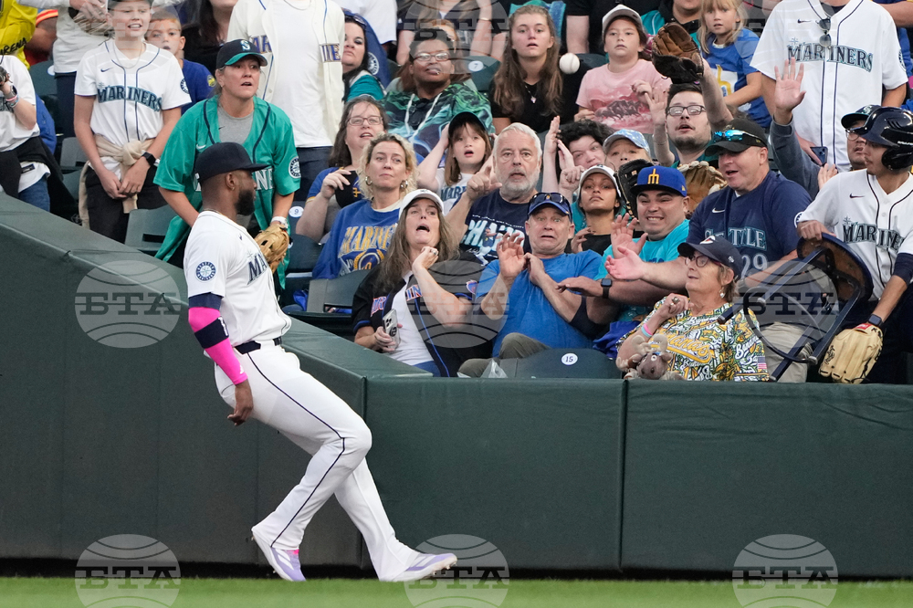 Fans react as Seattle Mariners right fielder Victor Robles is unable to reach a foul ball hit by Colorado Rockies' Blaine Crim during the first inning of a baseball game, Tuesday, Sept. 23, 2025, in Seattle. (AP Photo/Ryan Sun)
