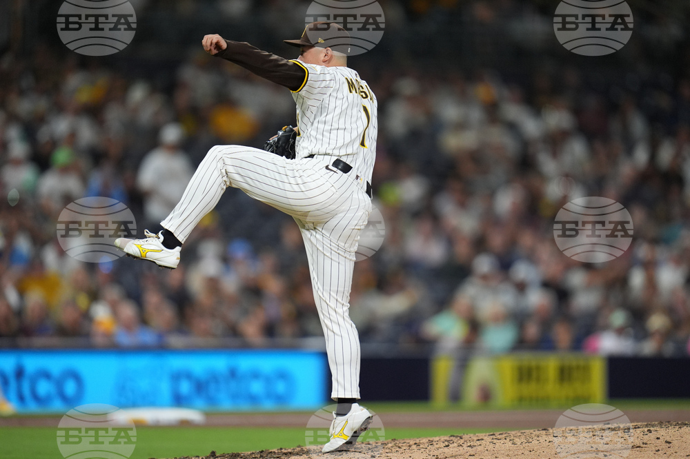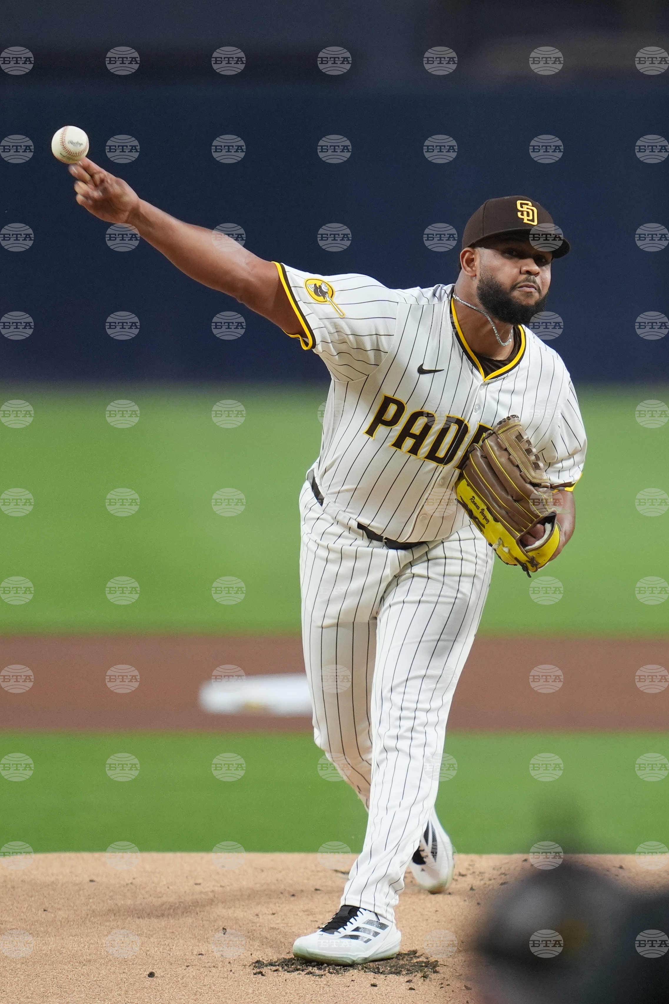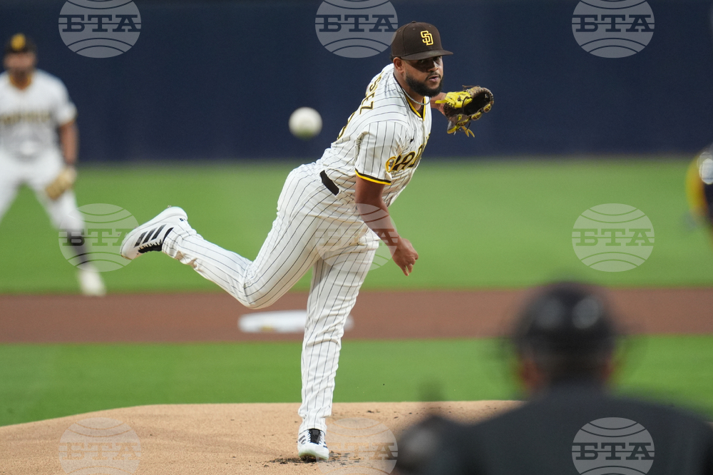 San Diego Padres starting pitcher Randy Vasquez works against a Milwaukee Brewers batter during the first inning of a baseball game Tuesday, Sept. 23, 2025, in San Diego. (AP Photo/Gregory Bull)