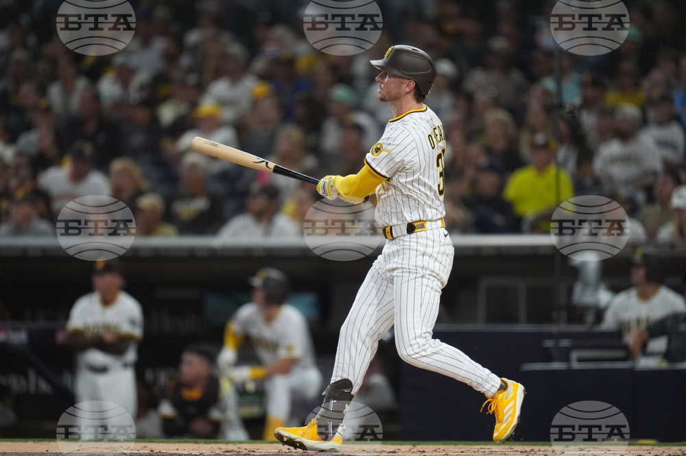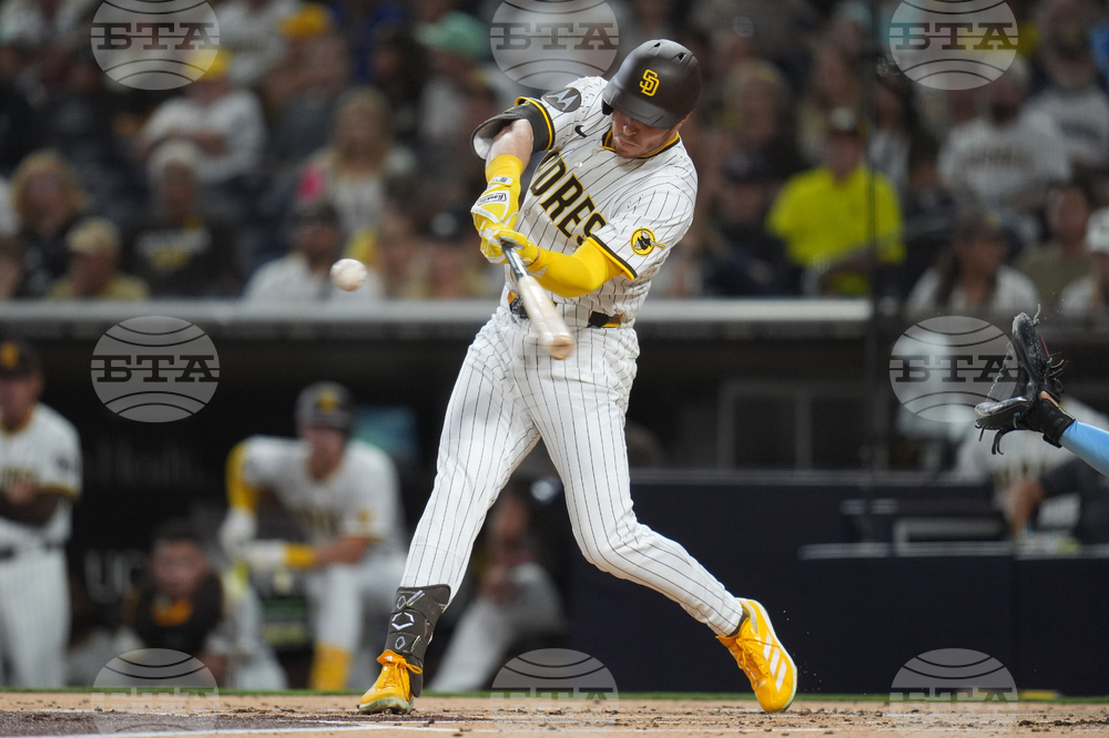 San Diego Padres' Ryan O'Hearn watches his grand slam during the first inning of a baseball game against the Milwaukee Brewers Tuesday, Sept. 23, 2025, in San Diego. (AP Photo/Gregory Bull)