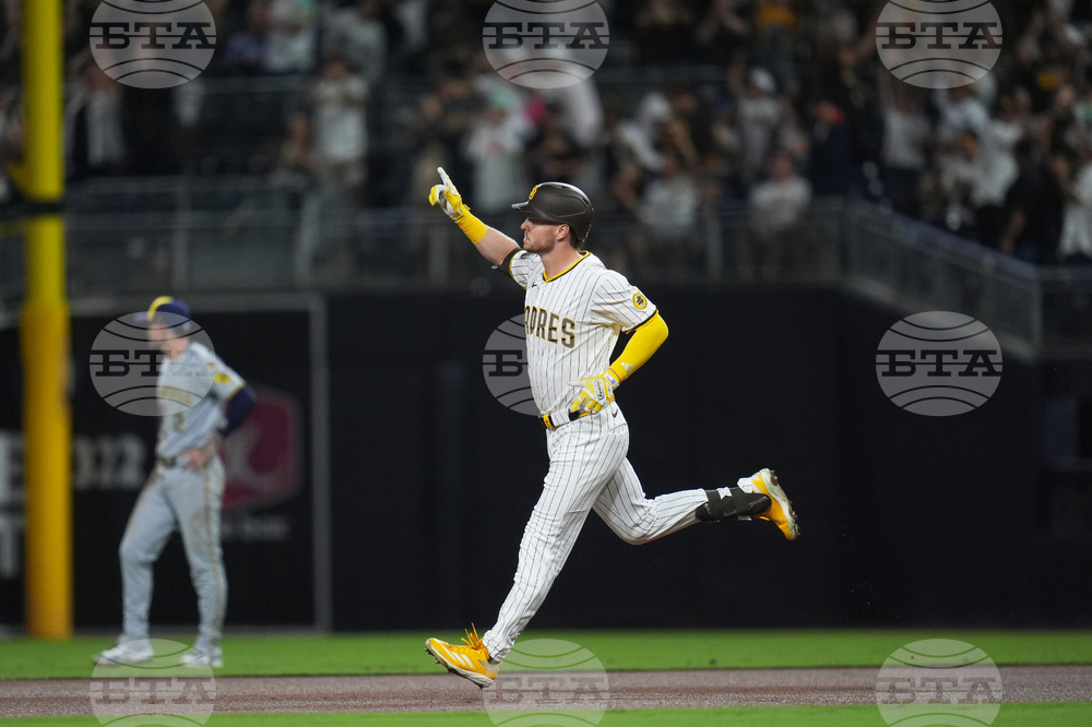 San Diego Padres' Jackson Merrill celebrates after hitting a home run during the sixth inning of a baseball game against the Milwaukee Brewers Wednesday, Sept. 24, 2025, in San Diego. (AP Photo/Gregory Bull)