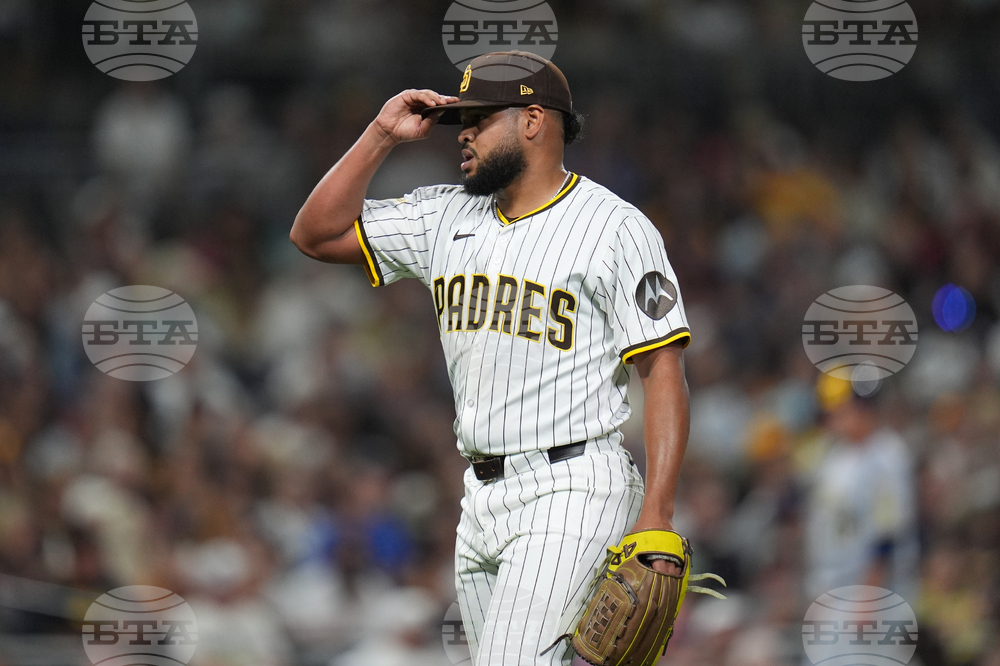 San Diego Padres starting pitcher Randy Vasquez adjusts his cap after the third out during the sixth inning of a baseball game against the Milwaukee Brewers Tuesday, Sept. 23, 2025, in San Diego. (AP Photo/Gregory Bull)