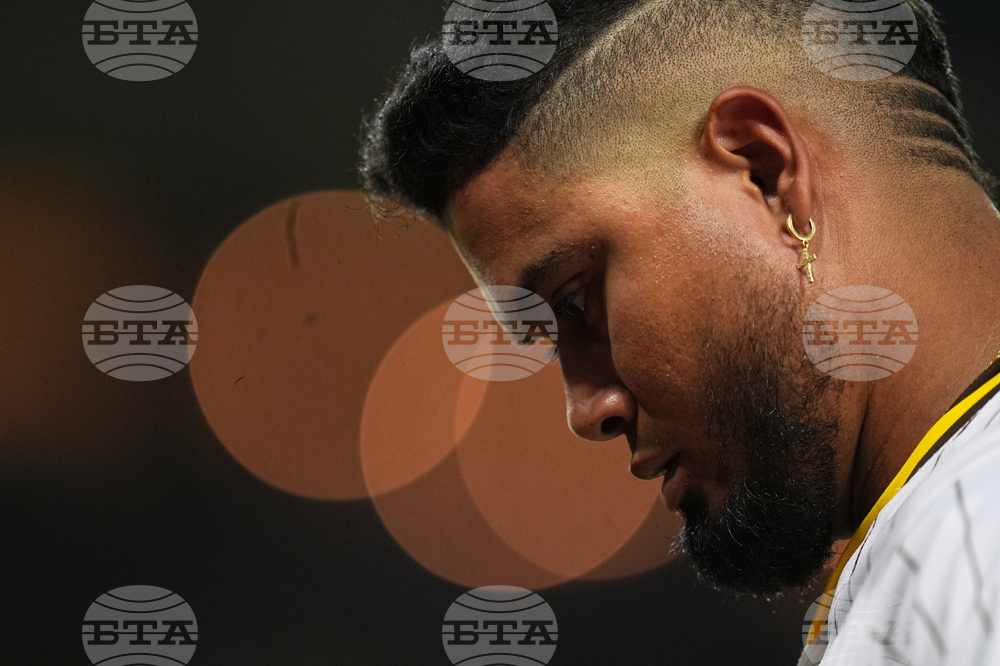 San Diego Padres starting pitcher Randy Vasquez is greeted by teammates after the third out during the seventh inning of a baseball game against the Milwaukee Brewers Tuesday, Sept. 23, 2025, in San Diego. (AP Photo/Gregory Bull)