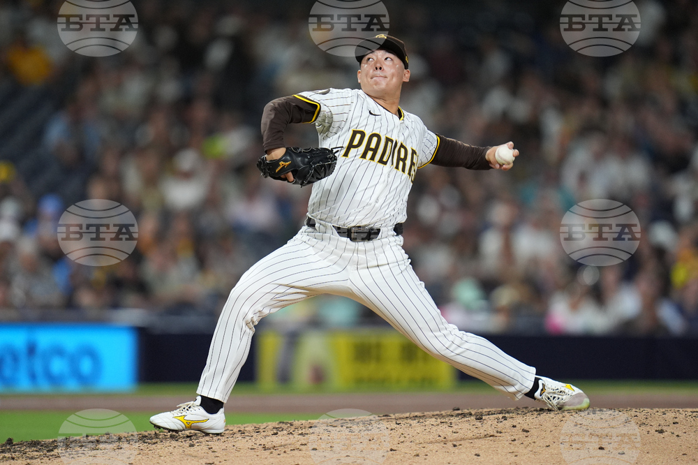 San Diego Padres relief pitcher Yuki Matsui works against a Milwaukee Brewers batter during the ninth inning of a baseball game Tuesday, Sept. 23, 2025, in San Diego. (AP Photo/Gregory Bull)