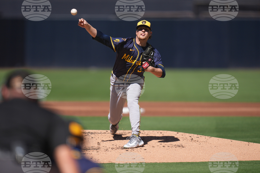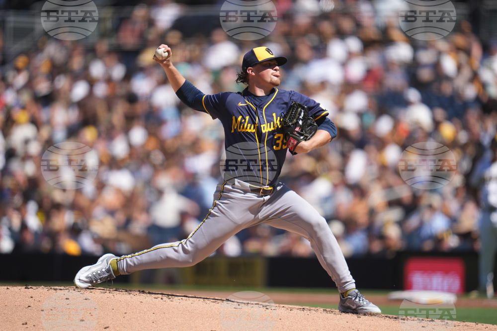 Milwaukee Brewers starting pitcher Bruce Zimmermann works against a San Diego Padres batter during the first inning of a baseball game Tuesday, Sept. 23, 2025, in San Diego. (AP Photo/Gregory Bull)
