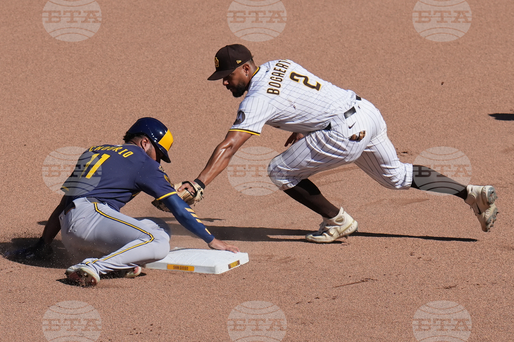 Milwaukee Brewers shortstop Andruw Monasterio, left, tags out San Diego Padres' Luis Arraez, as Arraez is caught stealing second base during the third inning of a baseball game Wednesday, Sept. 24, 2025, in San Diego. (AP Photo/Gregory Bull)