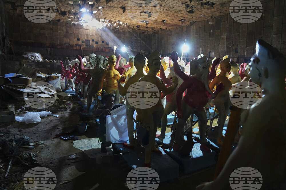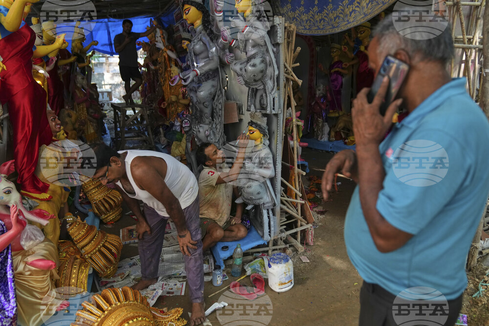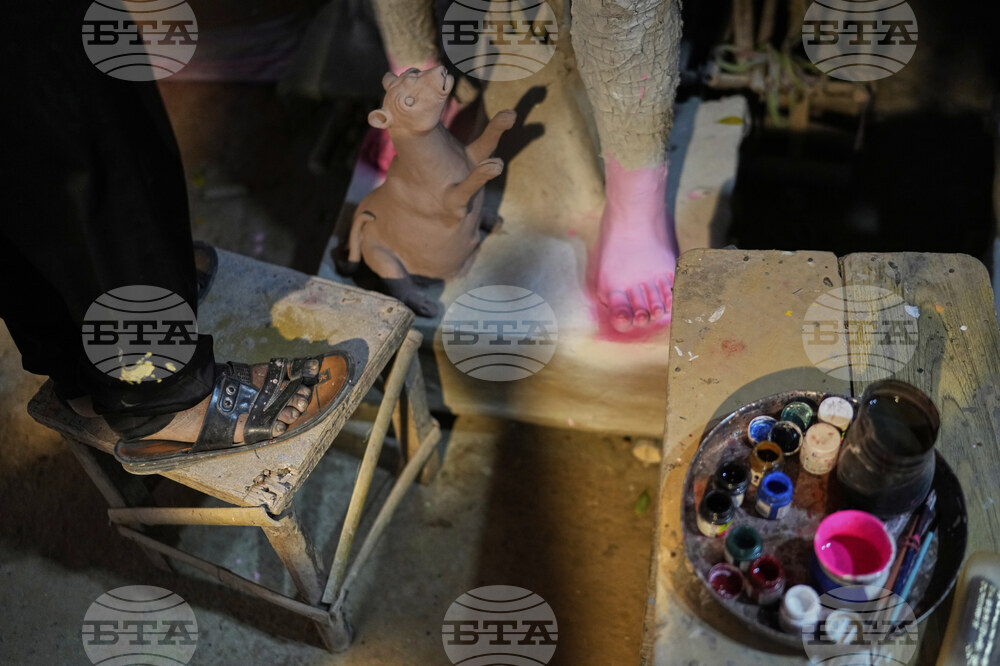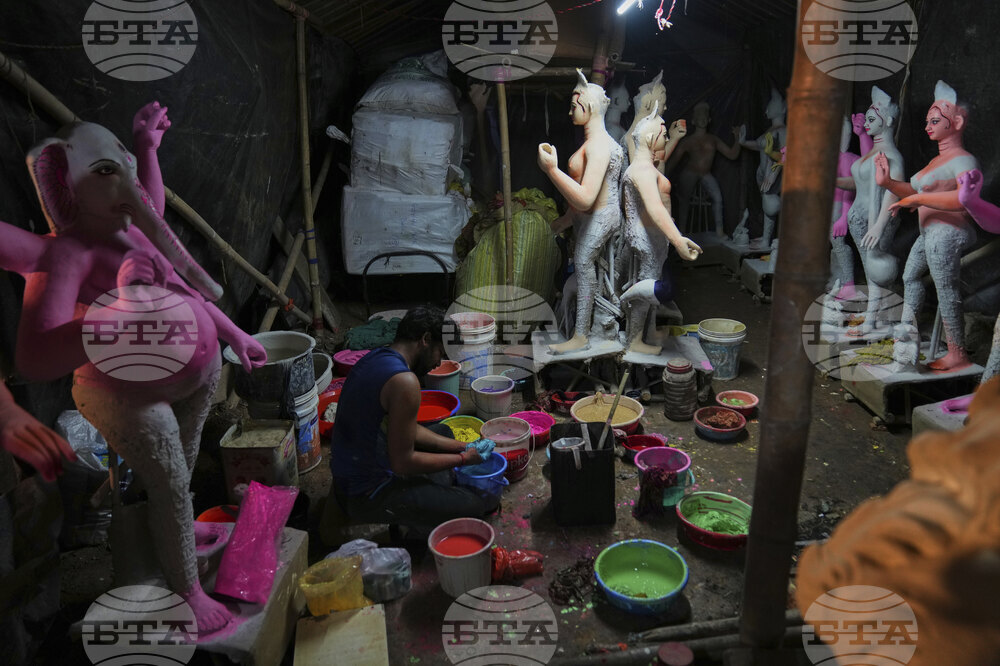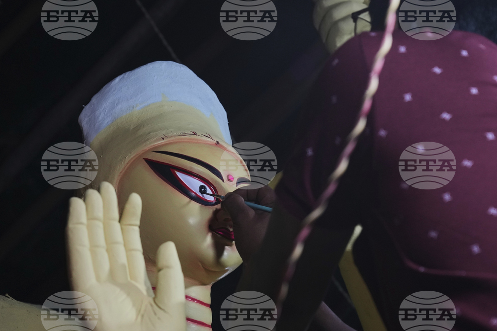 An artist from Kolkata prepares idols of Hindu goddess Durga ahead of the Durga Puja festival, in New Delhi, India, Friday, Sept. 19, 2025. (AP Photo/Manish Swarup)