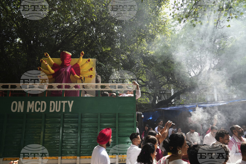 Devotees sing and dance as they transport an idol of the Hindu goddess Durga to their place of worship ahead of the Durga Puja festival in New Delhi, India, Sunday, Sept. 21, 2025. (AP Photo/Manish Swarup)