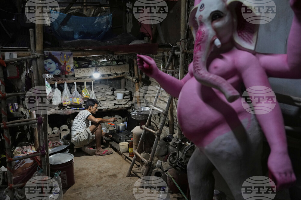 Workers take a break while creating idols of Hindu deities ahead of the Durga Puja festival in New Delhi, India, Friday, Sept. 19, 2025. (AP Photo/Manish Swarup)