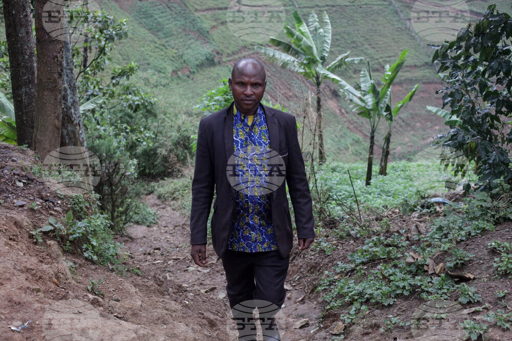 Philemon Mujuni, a reformed poacher, walks up a hill to his home at the foothill of Bwindi Impenetrable National Park in southwestern Uganda, Tuesday, Sept. 16, 2025. (AP Photo/Onen Patrick)