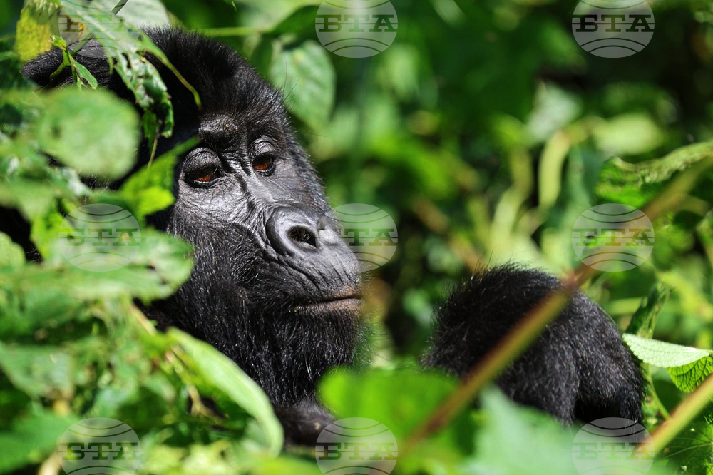 A mountain gorilla eats leaves in the forest of Bwindi Impenetrable National Park in southwestern Uganda, Wednesday, Sept. 17, 2025. (AP Photo/Rodney Muhumuza)