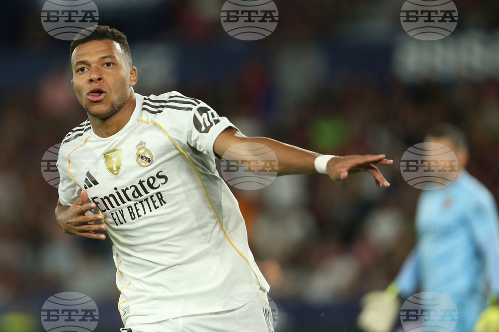 Real Madrid's Kylian Mbappe, celebrates after scoring his side's fourth goal with a penalty kick during the Spanish La Liga soccer match between Levante and Real Madrid at the Ciutat de Valencia stadium in Valencia, Spain, Tuesday, Sept. 23, 2025. (AP Photo/Alberto Saiz)