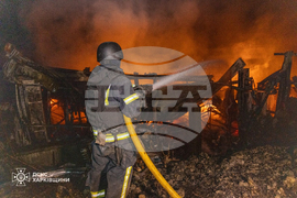 In this photo provided by the Ukrainian Emergency Service, firefighters put out the fire following a Russian drones attack in Kharkiv, Ukraine, Wednesday, Sept. 24, 2025. (Ukrainian Emergency Service via AP)