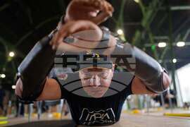 A Ukrainian war veteran exercises during open sports workshop for amputee soldiers in Kyiv, Ukraine, on Wednesday, Sept. 24, 2025. (AP Photo/Evgeniy Maloletka)