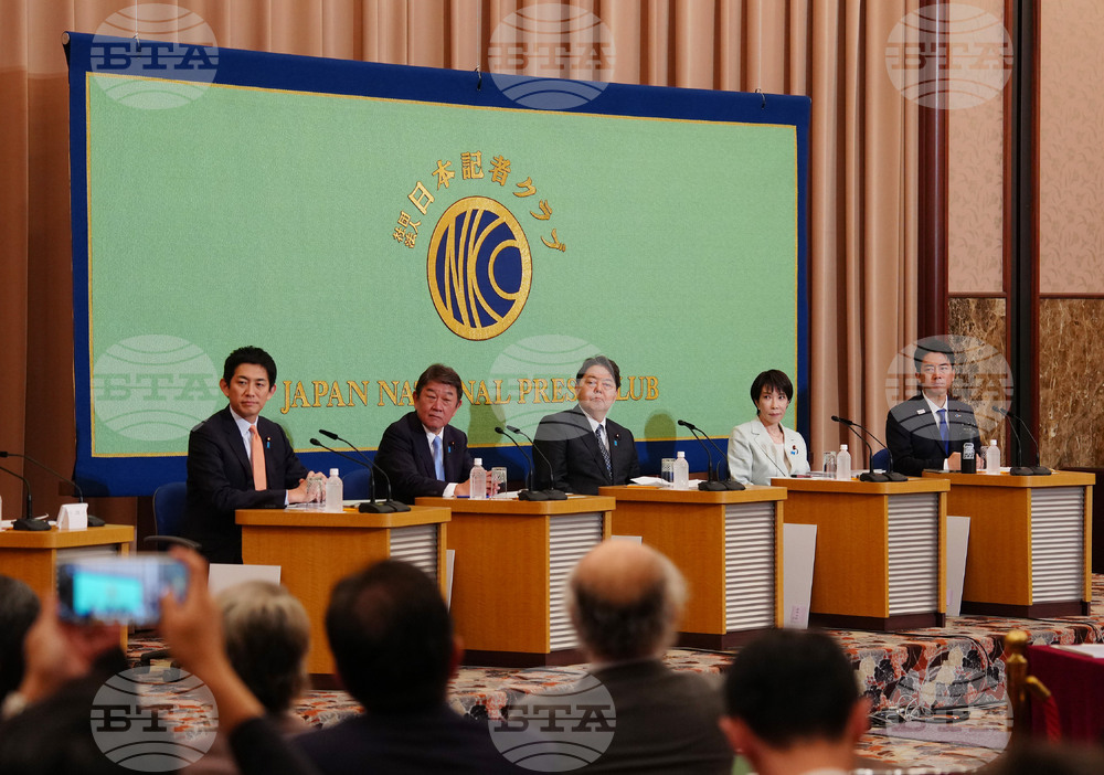 Candidates running for the Liberal Democratic Party's (LDP) leader attend its election debate at the Japan National Press Club in Tokyo, Wednesday, Sept. 24, 2025. From left are former Economic Security Minister Takayuki Kobayashi, former Secretary-General Toshimitsu Motegi, Chief Cabinet Secretary Yoshimasa Hayashi, former Economic Security Minister Sanae Takaichi and Agriculture Minister Shinjiro Koizumi. (Jia Haocheng/Pool Photo via AP)