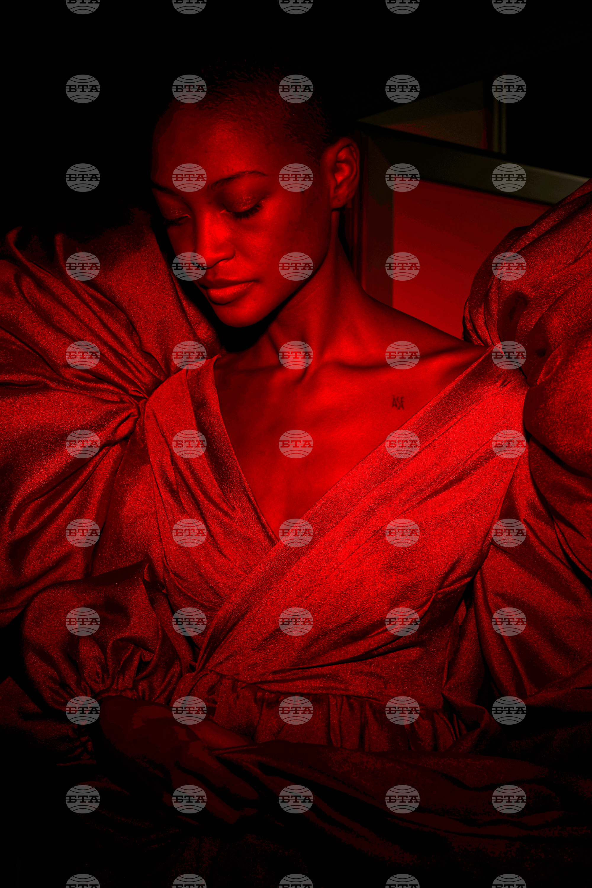 FILE - A model wears design by De La Cierva y Nicolas backstage during the brand's show at Fashion Week in Madrid, Spain, Friday, Sept. 19, 2025. (AP Photo/Manu Fernandez)