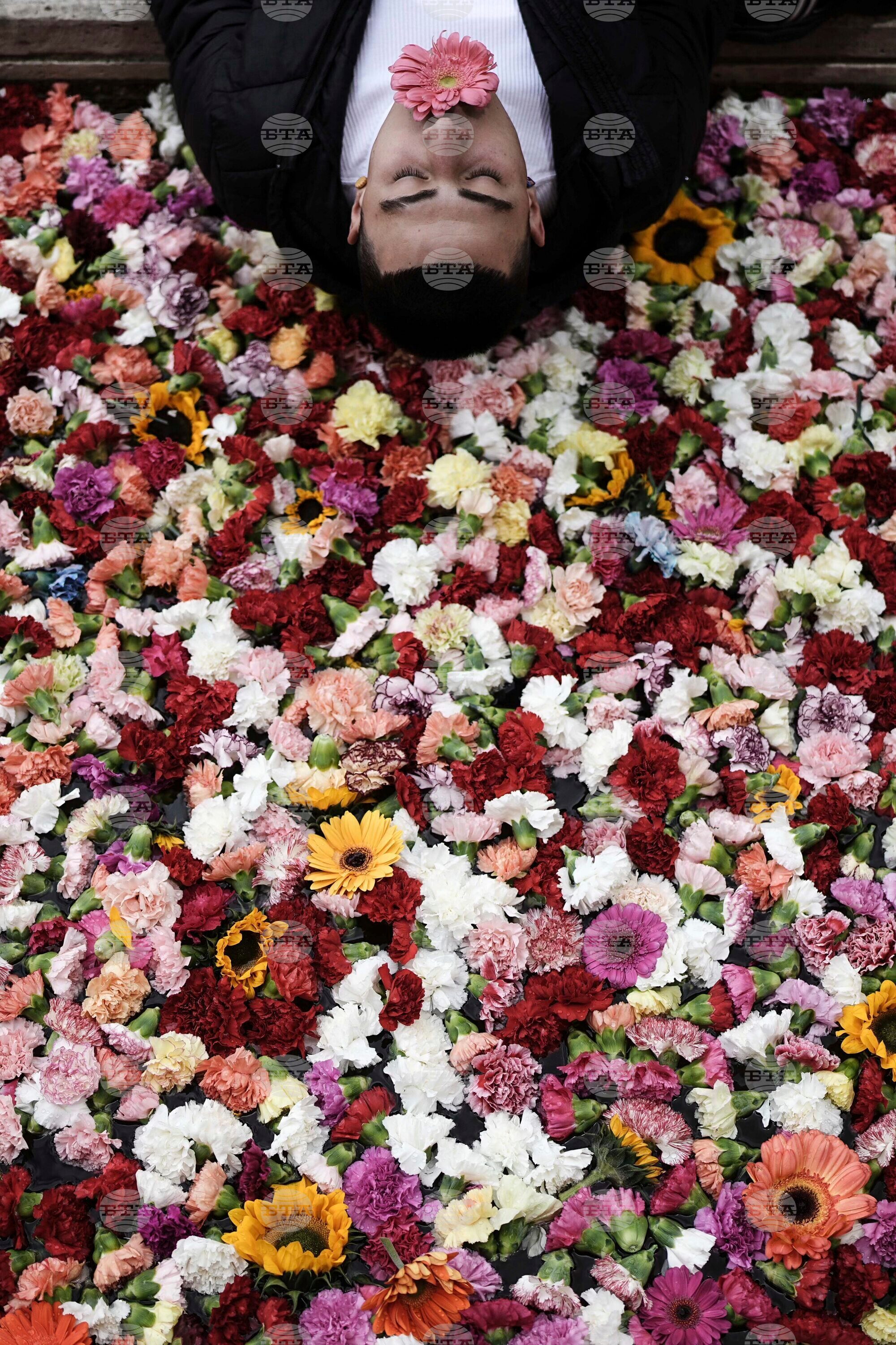 FILE - A pedestrian poses for a photo on the edge of an installation, a canal filled with flowers, during the opening of the city's first art biennial in downtown Bogota, Colombia, Saturday, Sept. 20, 2025. (AP Photo/Ivan Valencia)