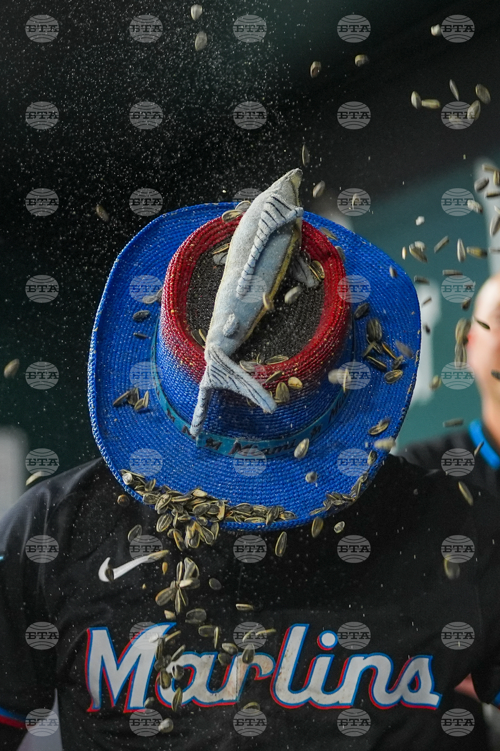 FILE - Miami Marlins' Otto Lopez, not visible, throws sunflower seeds on teammate Connor Norby while being greeted in the dugout after hitting a solo home run off Texas Rangers pitcher Jack Leiter during the sixth inning of a baseball game Saturday, Sept. 20, 2025, in Arlington, Texas. (AP Photo/Julio Cortez)