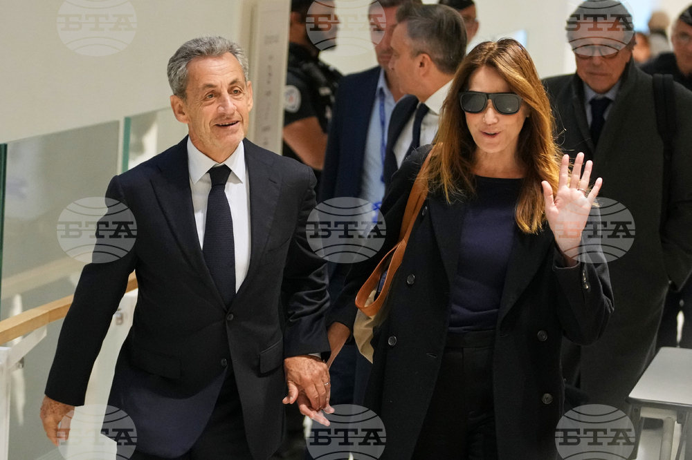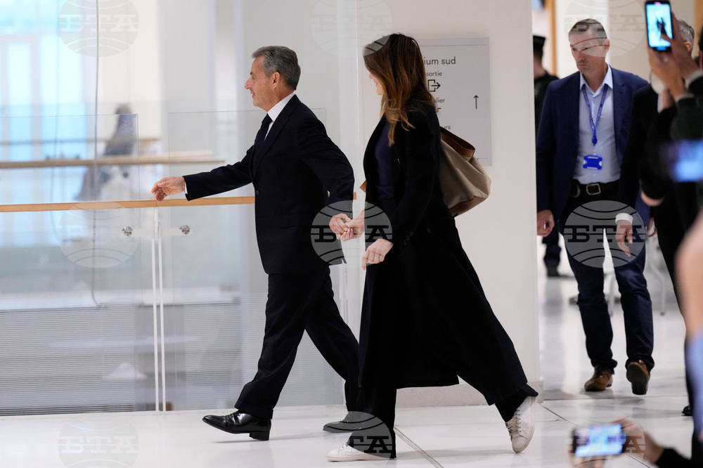 Former French President Nicolas Sarkozy and his wife Carla Bruni Sarkozy arrive to the courtroom for his verdict for alleged illegal financing of his 2007 presidential campaign by the government of then-Libyan leader Moammar Gadhafi, Thursday, Sept. 25, 2025 in Paris. (AP Photo/Michel Euler)