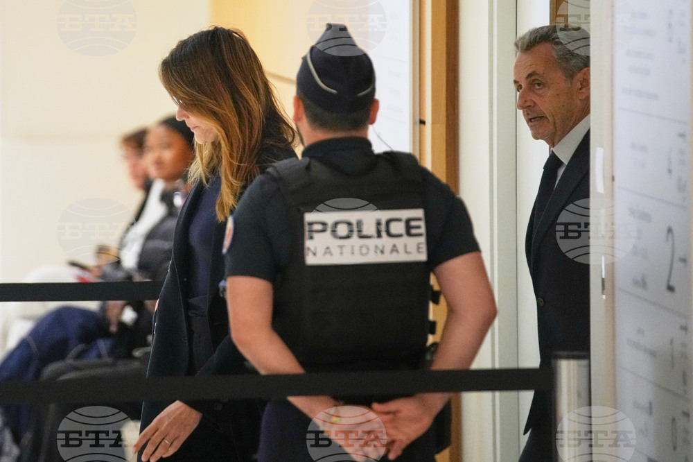 Former French President Nicolas Sarkozy, center, and his wife Carla Bruni, center right, arrive at the courthouse, in Paris, France, Thursday, Sept. 25, 2025. (AP Photo/Christophe Ena)