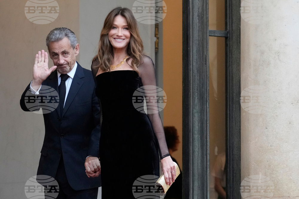 FILE - Former French President Nicolas Sarkozy and his wife Carla Bruni Sarkozy arrive at the Elysee Palace before a stade dinner hosted by French President Emmanuel Macron for Brazil's President Luiz Inacio Lula da Silva Thursday, June 5, 2025 in Paris. (AP Photo/Michel Euler, File)