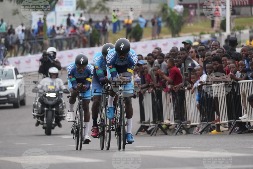 Benin cyclists compete, during the team time trial mixed relay event, at the road cycling World Championships in Kigali, Rwanda, Wednesday, Sept. 24, 2025. (AP Photo/Jerome Delay)