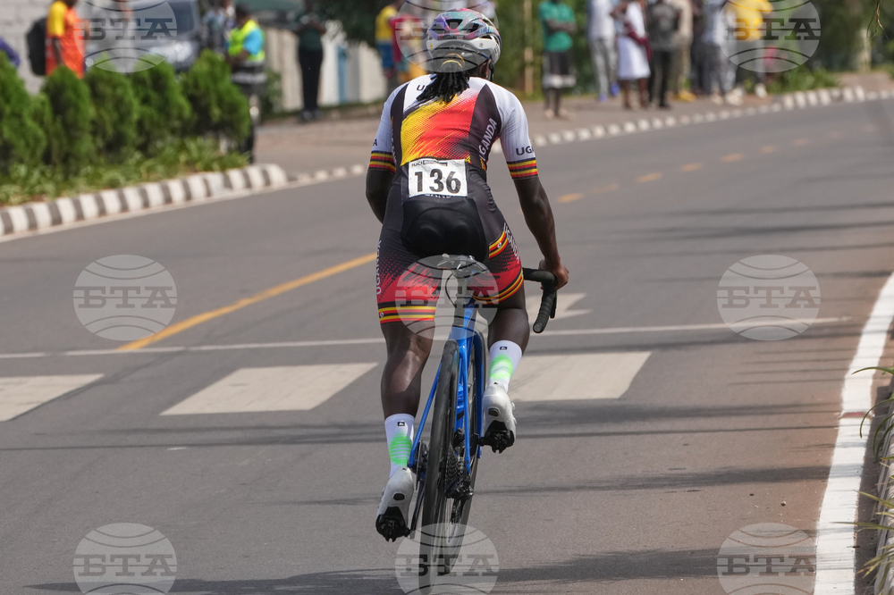 Uganda's cyclists compete, during the team time trial mixed relay event, at the road cycling World Championships in Kigali, Rwanda, Wednesday, Sept. 24, 2025. (AP Photo/Jerome Delay)