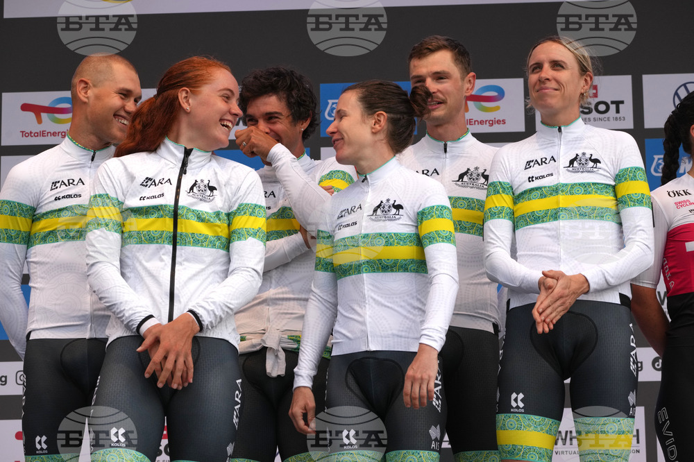 Australia team competes, during the team time trial mixed relay event, at the road cycling World Championships in Kigali, Rwanda, Wednesday, Sept. 24, 2025. (AP Photo/Jerome Delay)