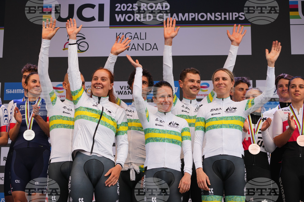 Team Australia poses on the podium after winning the team time trial mixed relay event, at the road cycling World Championships in Kigali, Rwanda, Wednesday, Sept. 24, 2025. (AP Photo/Jerome Delay)