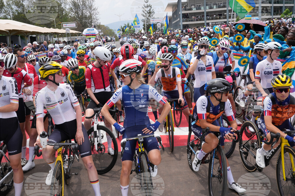 Competitors get ready to start the women's Under 23 race, at the road cycling World Championships in Kigali, Rwanda, Thursday, Sept. 25, 2025. (AP Photo/Jerome Delay)