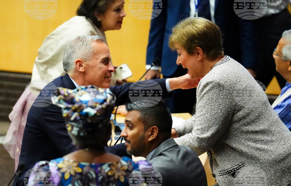Prime Minister Mark Carney, left, greets International Monetary Fund (IMF) Managing Director Kristalina Georgieva as they arrive to take part in the 'First Biennial Summit for a Sustainable, Inclusive and Resilient Global Economy' during the 80th session of the United Nations General Assembly, Wednesday, Sept. 24, 2025. (Sean Kilpatrick /The Canadian Press via AP)