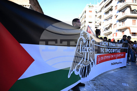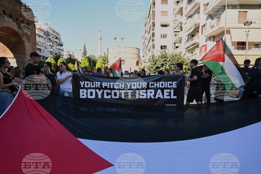 Pro-Palestinian protesters, most of them PAOK fans, gather ahead of a Europa League soccer match between PAOK and Israeli team Maccabi Tel Aviv in the port city of Thessaloniki, northern Greece, Wednesday, Sept. 24, 2025. (AP Photo/Giannis Papanikos)