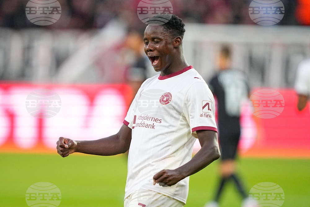 FC Midtjylland's Ousmane Diao, center, celebrates scoring with teammates during the Europa League soccer match between FC Midtjylland and SK Sturm Graz at the MCH Arena in Herning, Denmark, Wednesday Sept. 24, 2025. (Bo Amstrup/Ritzau Scanpix via AP)