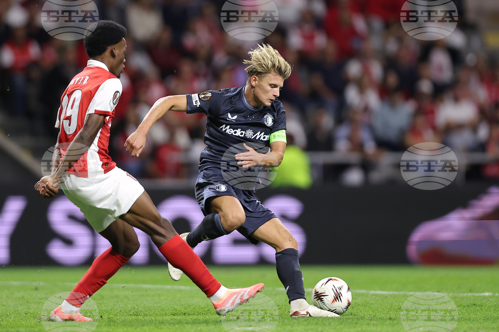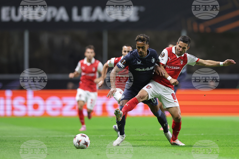 Feyenoord's Goncalo Borges vies for the ball with Braga's Bright Arrey-Mbi, right, during the Europa League opening phase soccer match between SC Braga and Feyenoord at the Municipal stadium in Braga, Portugal, Wednesday, Sept. 24, 2025. (AP Photo/Miguel Angelo Pereira)