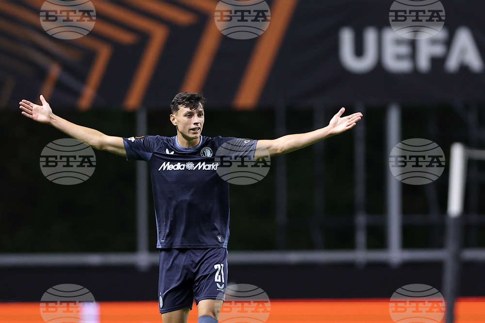 Feyenoord's Sam Steijn controls the ball during the Europa League opening phase soccer match between SC Braga and Feyenoord at the Municipal stadium in Braga, Portugal, Wednesday, Sept. 24, 2025. (AP Photo/Miguel Angelo Pereira)