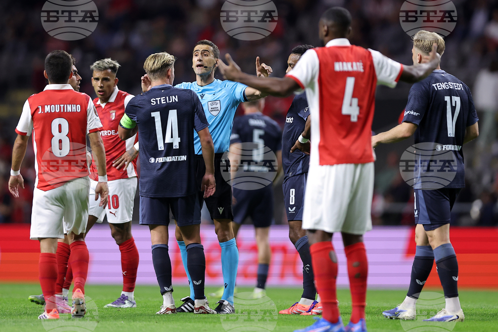 Referee Nikola Dabanovic speaks to Feyenoord's Sam Steijn during the Europa League opening phase soccer match between SC Braga and Feyenoord at the Municipal stadium in Braga, Portugal, Wednesday, Sept. 24, 2025. (AP Photo/Miguel Angelo Pereira)