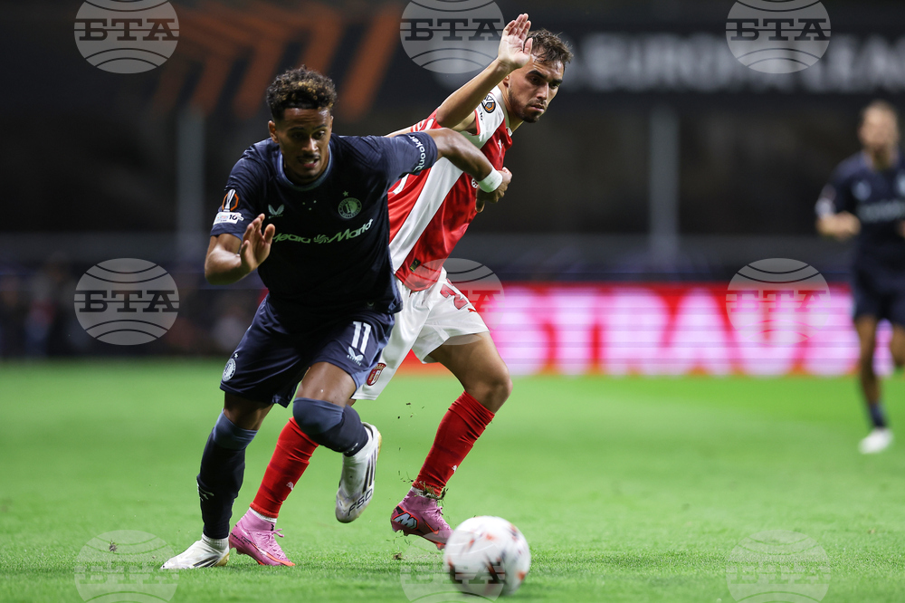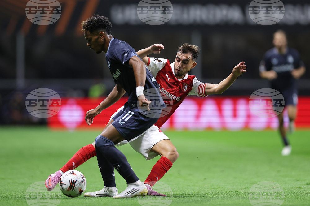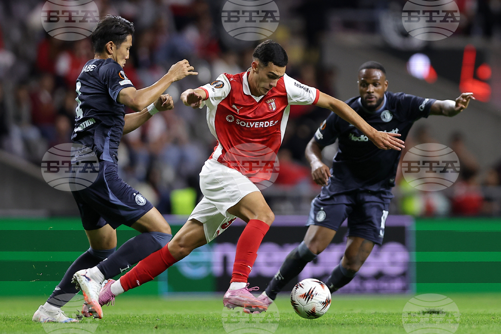 Braga's Ricardo Horta vies for the ball with Feyenoord's Goncalo Borges, left, during the Europa League opening phase soccer match between SC Braga and Feyenoord at the Municipal stadium in Braga, Portugal, Wednesday, Sept. 24, 2025. (AP Photo/Miguel Angelo Pereira)