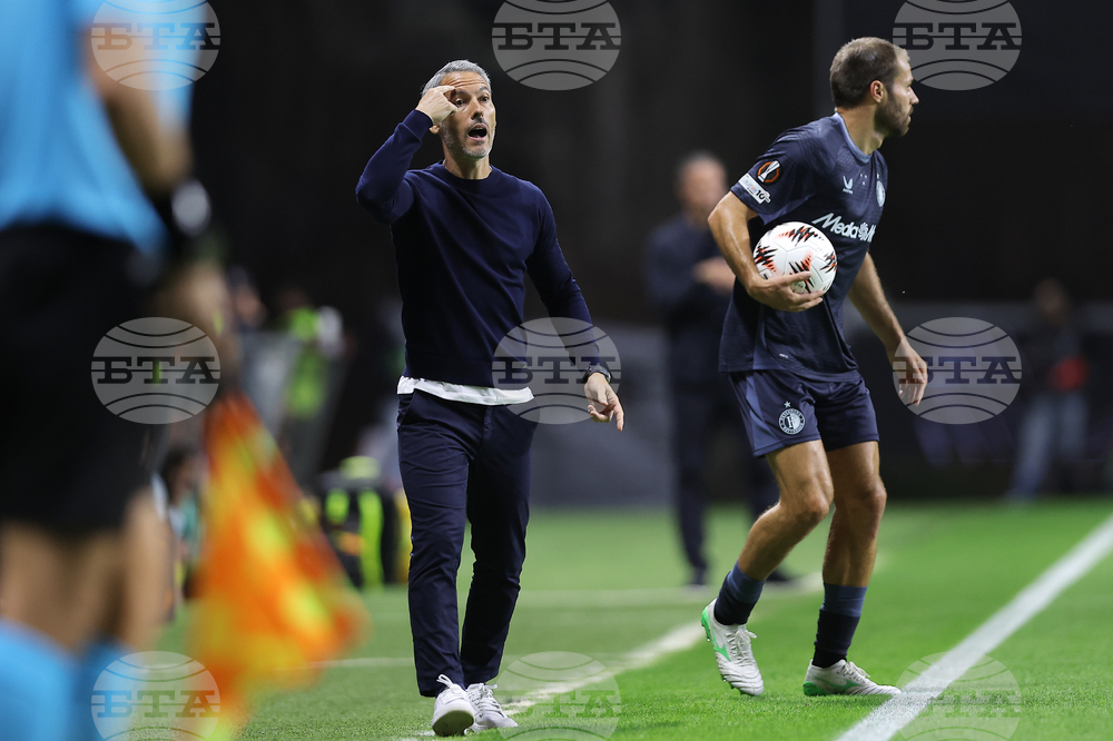 Feyenoord's head coach Robin van Persie comes on to the field for the Europa League opening phase soccer match between SC Braga and Feyenoord at the Municipal stadium in Braga, Portugal, Wednesday, Sept. 24, 2025. (AP Photo/Miguel Angelo Pereira)
