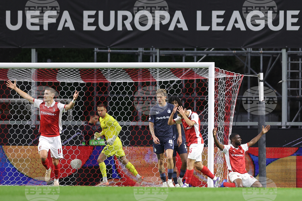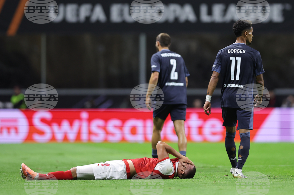 Braga players react after a missed chance to score during the Europa League opening phase soccer match between SC Braga and Feyenoord at the Municipal stadium in Braga, Portugal, Wednesday, Sept. 24, 2025. (AP Photo/Miguel Angelo Pereira)