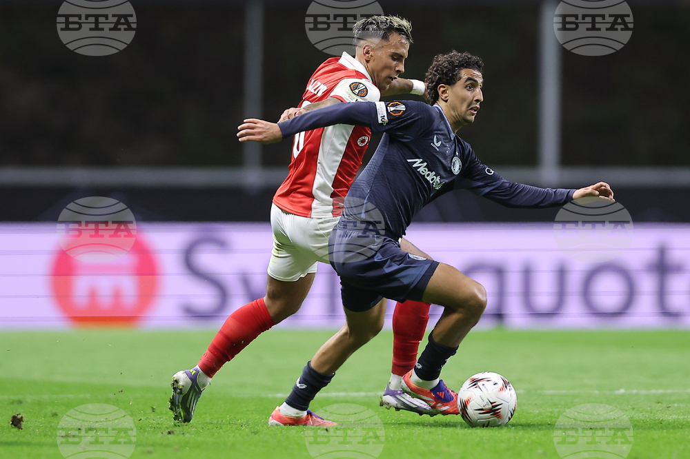 Braga's Fran Navarro, left, celebrates after scoring the opening goal during the Europa League opening phase soccer match between SC Braga and Feyenoord at the Municipal stadium in Braga, Portugal, Wednesday, Sept. 24, 2025. (AP Photo/Miguel Angelo Pereira)