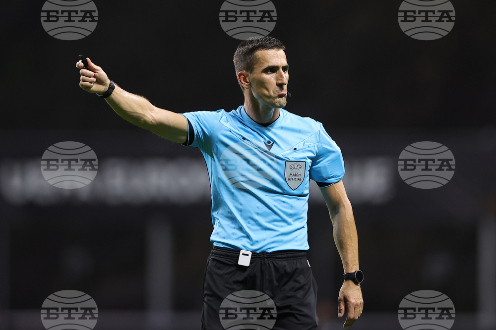 Referee Nikola Dabanovic gestures during the Europa League opening phase soccer match between SC Braga and Feyenoord at the Municipal stadium in Braga, Portugal, Wednesday, Sept. 24, 2025. (AP Photo/Miguel Angelo Pereira)