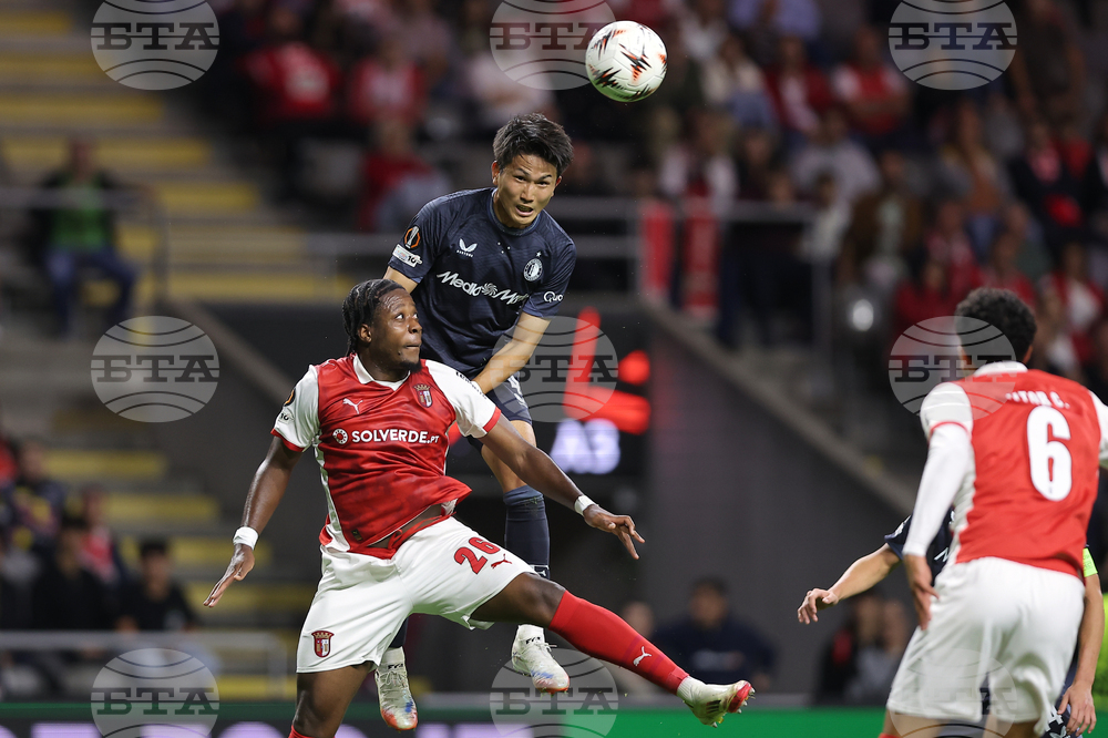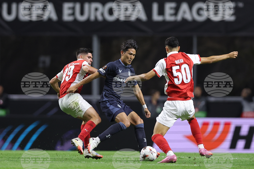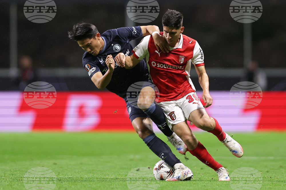 Braga's Fran Navarro fights for the ball with Feyenoord's Tsuyoshi Watanabe during the Europa League opening phase soccer match between SC Braga and Feyenoord at the Municipal stadium in Braga, Portugal, Wednesday, Sept. 24, 2025. (AP Photo/Miguel Angelo Pereira)