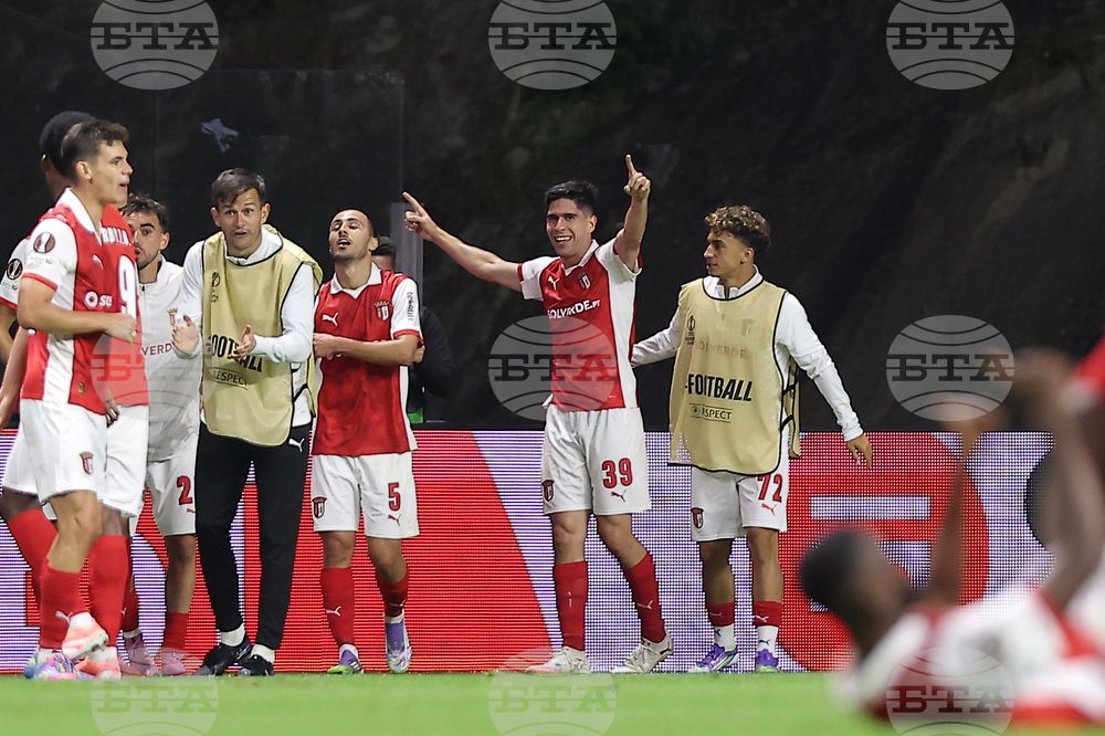 Braga's Fran Navarro, 2nd right, celebrates after scoring the opening goal during the Europa League opening phase soccer match between SC Braga and Feyenoord at the Municipal stadium in Braga, Portugal, Wednesday, Sept. 24, 2025. (AP Photo/Miguel Angelo Pereira)
