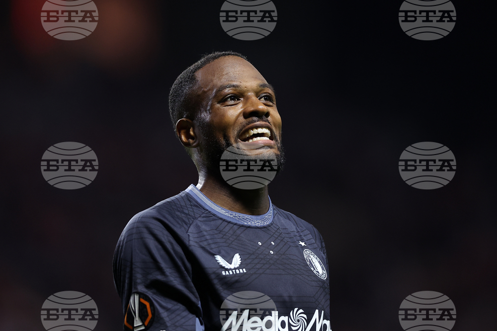 Feyenoord's Cyle Larin reacts during the Europa League opening phase soccer match between SC Braga and Feyenoord at the Municipal stadium in Braga, Portugal, Wednesday, Sept. 24, 2025. (AP Photo/Miguel Angelo Pereira)