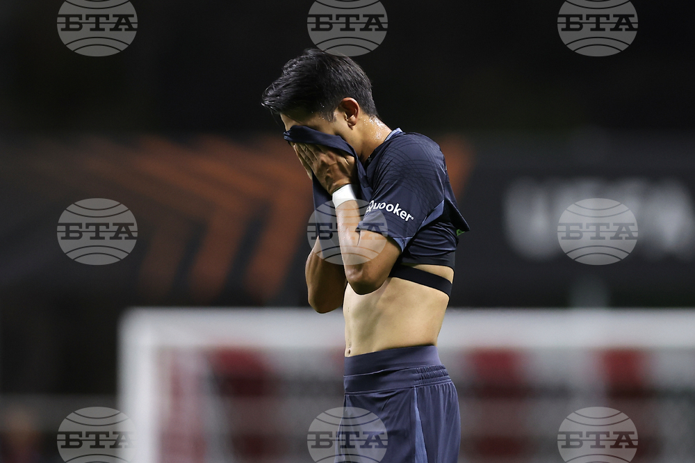 Feyenoord's Tsuyoshi Watanabe reacts at the end of the Europa League opening phase soccer match between SC Braga and Feyenoord at the Municipal stadium in Braga, Portugal, Wednesday, Sept. 24, 2025. (AP Photo/Miguel Angelo Pereira)